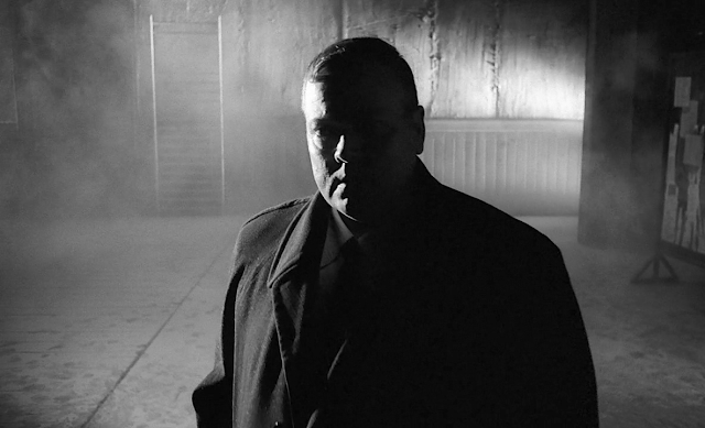 除了和画家对话的场景以外,另一处独特运用光线的地方就是在杂物间惩罚两个探员的场景。这里摇曳的灯光,人物时隐时现,以及急促的剪辑和独特的镜头角度,更加突出了被拷打的两个人的痛苦以及K内心的挣扎。